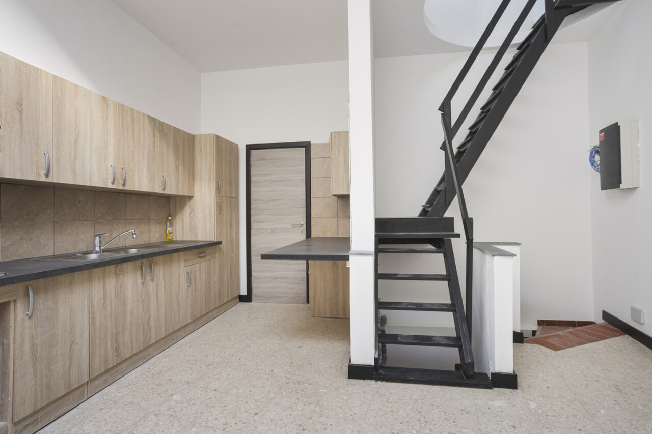 Le rez-de-chaussée comprend un espace commercial de 48 m² avec, à l’arrière, une cuisine de 16 m². Par un escalier fixe, on accède au premier étage avec deux pièces de 30 m² et 16 m², pouvant servir de bureaux, de stockage ou d’espace privé.