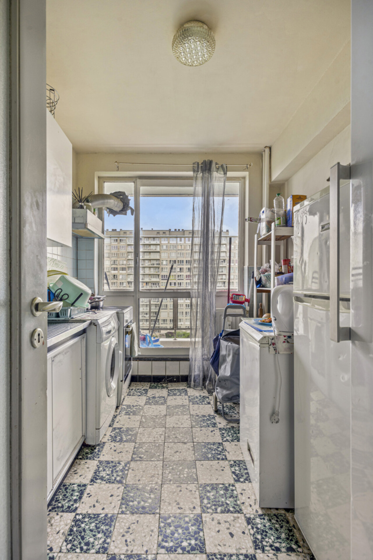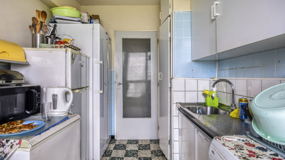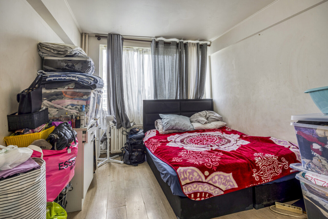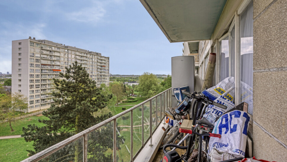 Op het zevende verdiep bevindt zich dit op te frissen, lichtrijke tweekamerappartement met privatieve kelder.