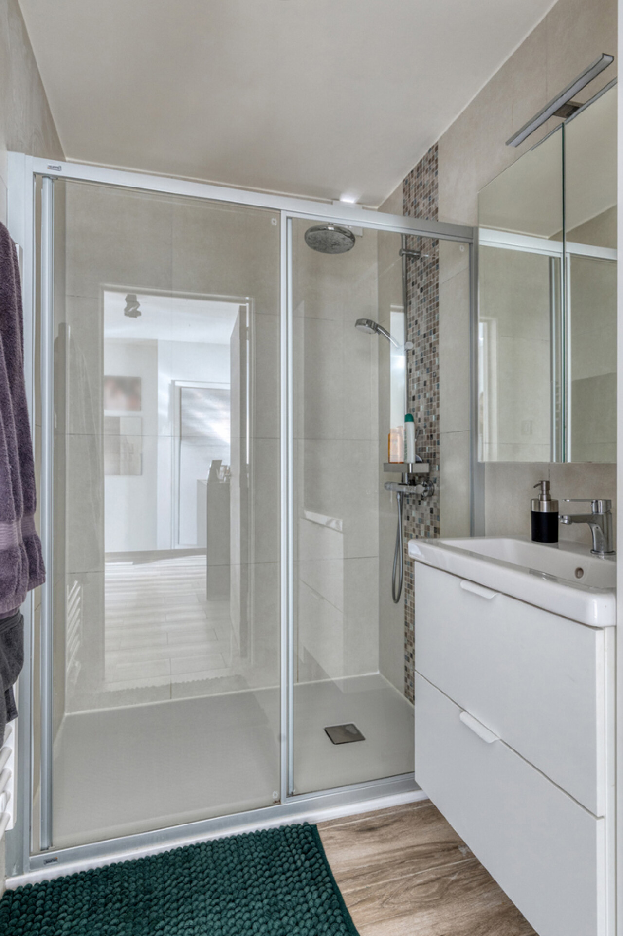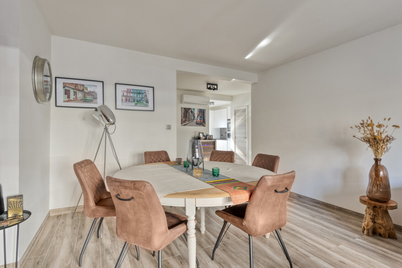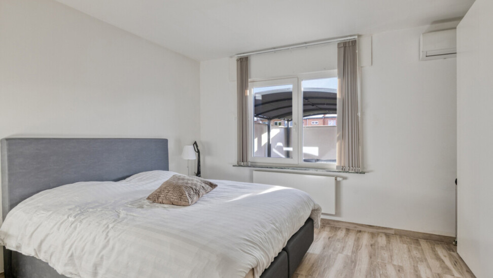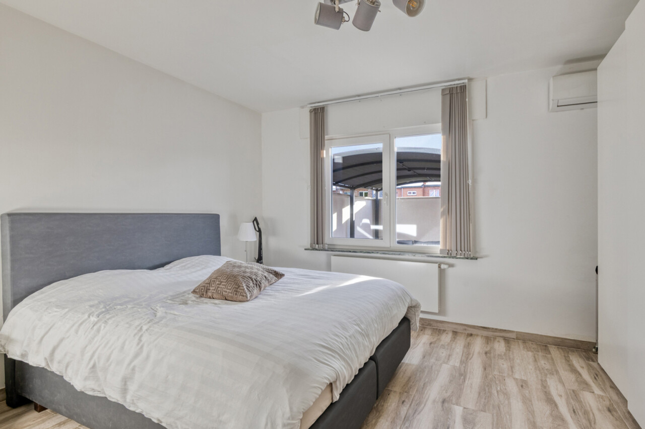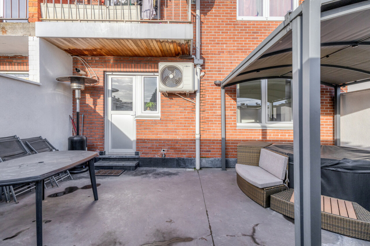 Verder beschikt het appartement over een apart toilet, een praktische berging met aansluiting voor een wasmachine en een moderne badkamer met inloopdouche. De comfortabele slaapkamer biedt alle rust en comfort. Het appartement is uitgerust met airconditioning en rolluiken en werd afgewerkt met een hoge afwerkingsgraad, wat zorgt voor een instapklare woonervaring.