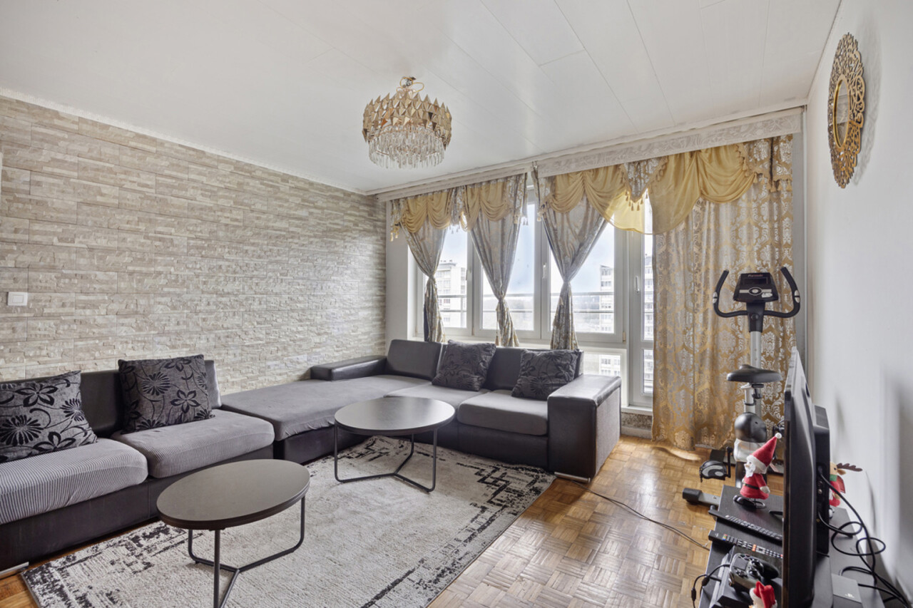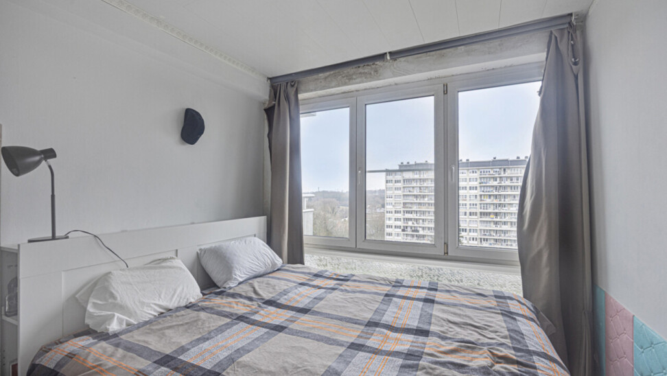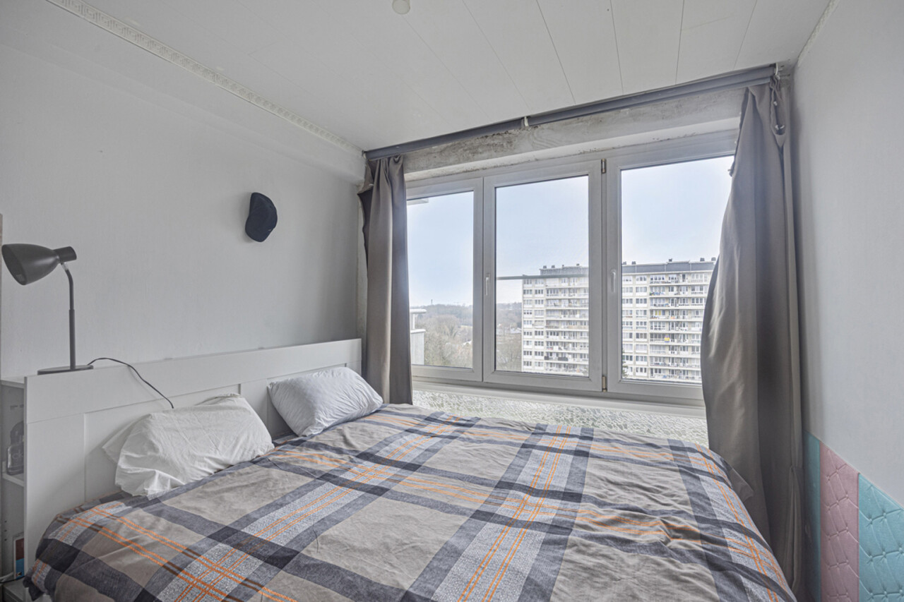 Lichtrijk tweekamerappartement op de 9e verdieping, deels te renoveren, met een privékelder en een zuidwestgericht terras van 6 m² dat een prachtig uitzicht op het park biedt.