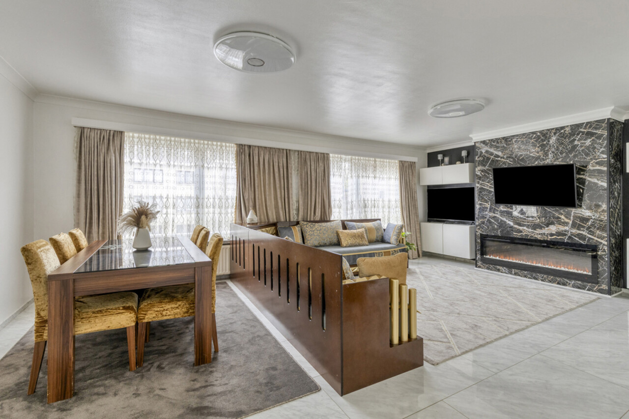 Via de ruime inkomhal met vestiairekast betreedt u de lichtrijke living van 35 m² met gezellige open haard. Aansluitend vindt u de volledig ingerichte gesloten keuken van 9 m².