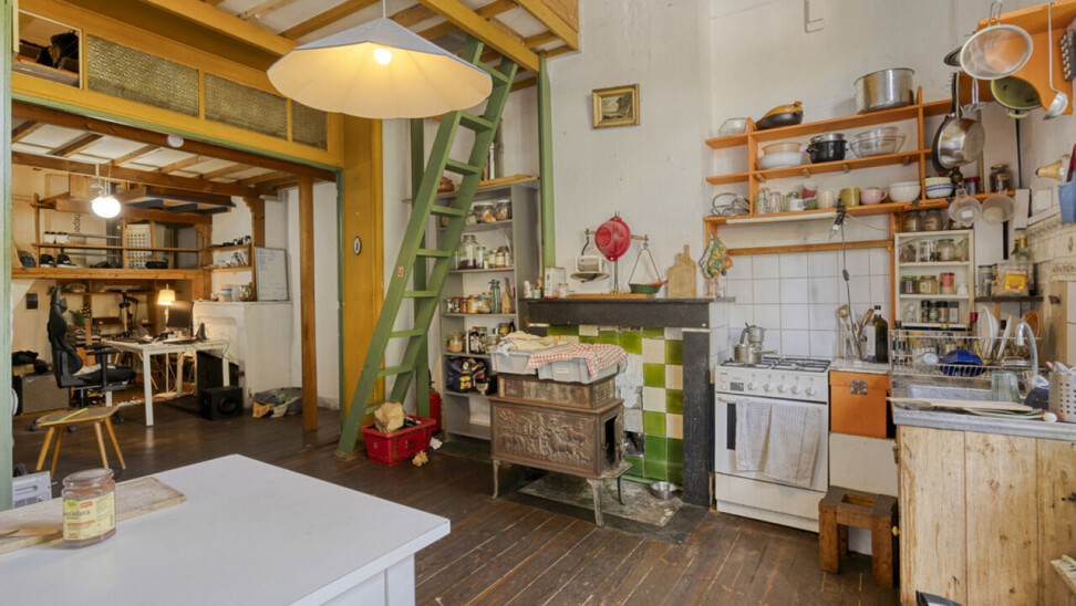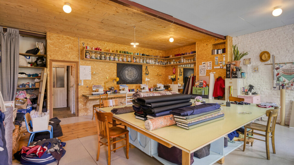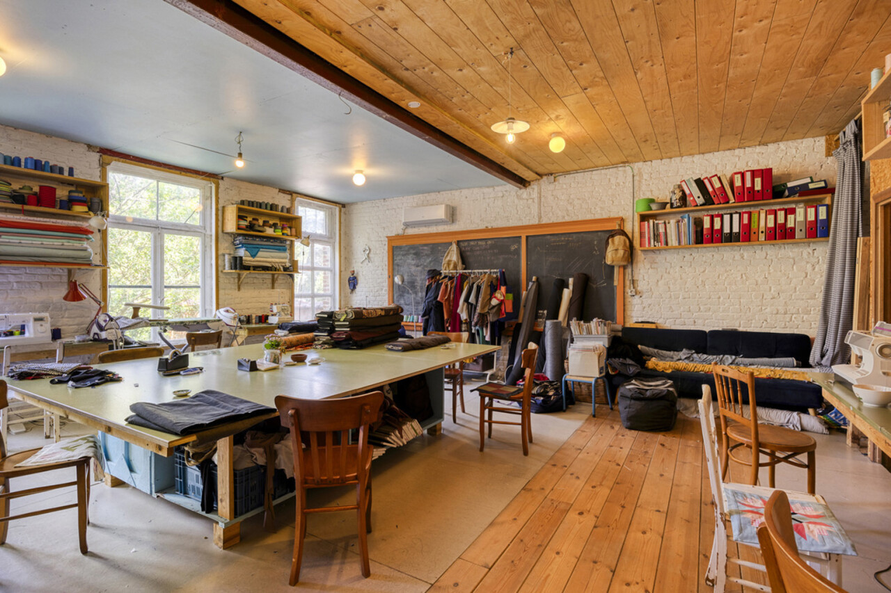 Werkplaats achterin hoofdgebouw gelegen. Indeling: bestaande uit 3 niveau's: tuinniveau (-1) (+/- 64m²), straatniveau (+/- 64m²) en zolderniveau (+/- 50m²).