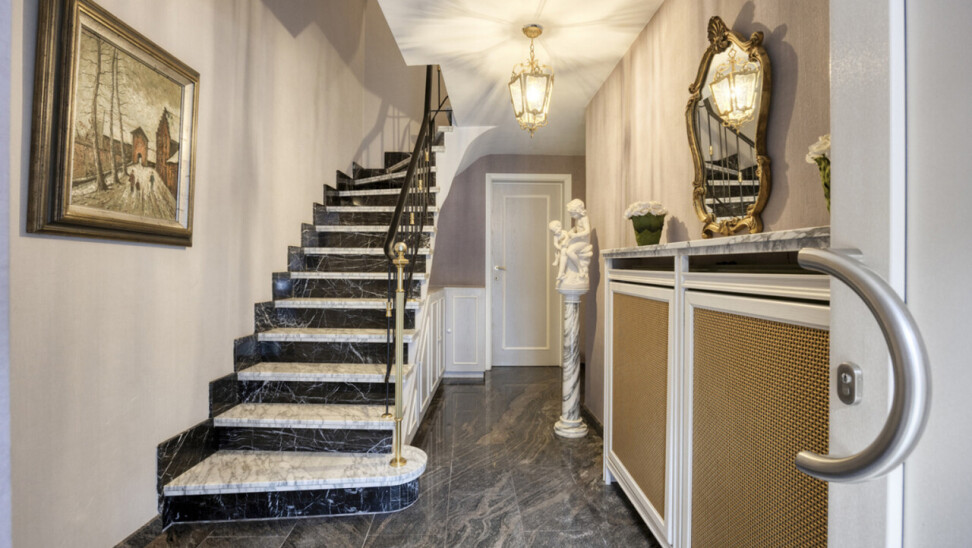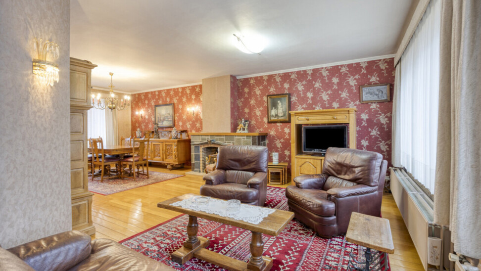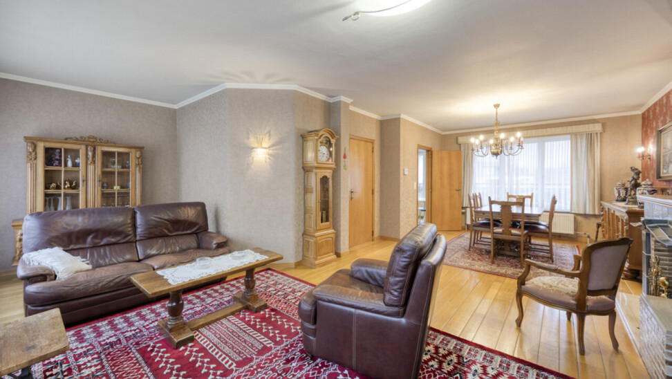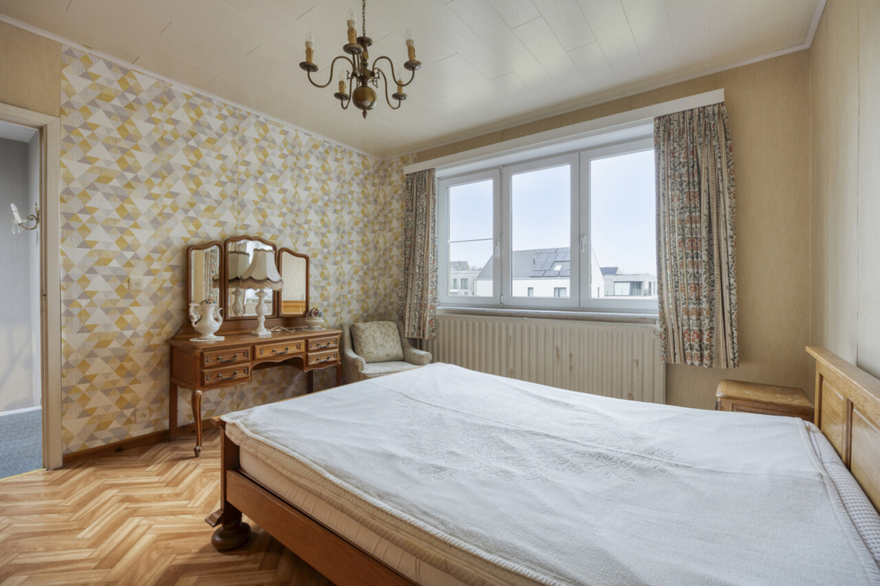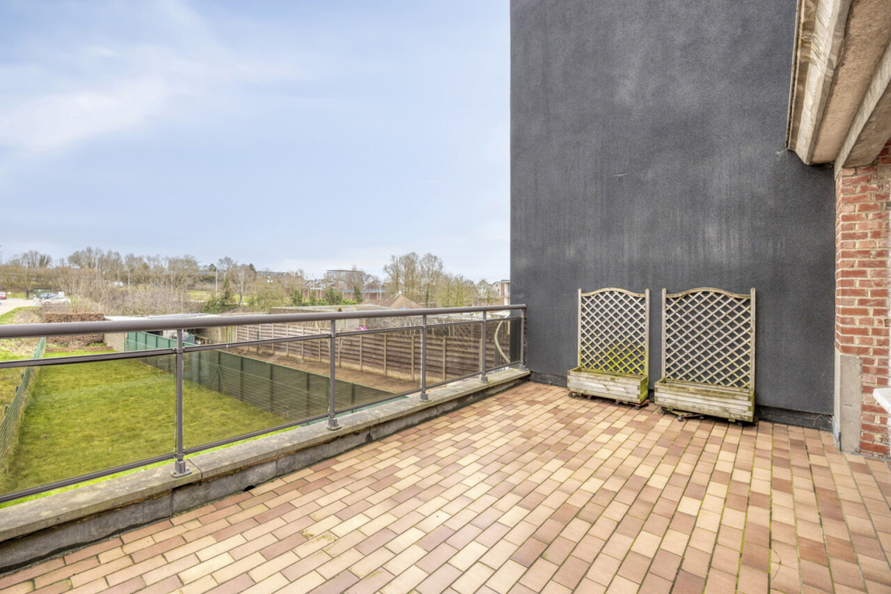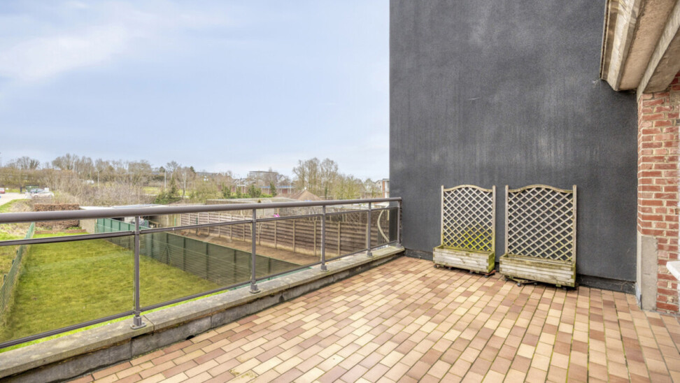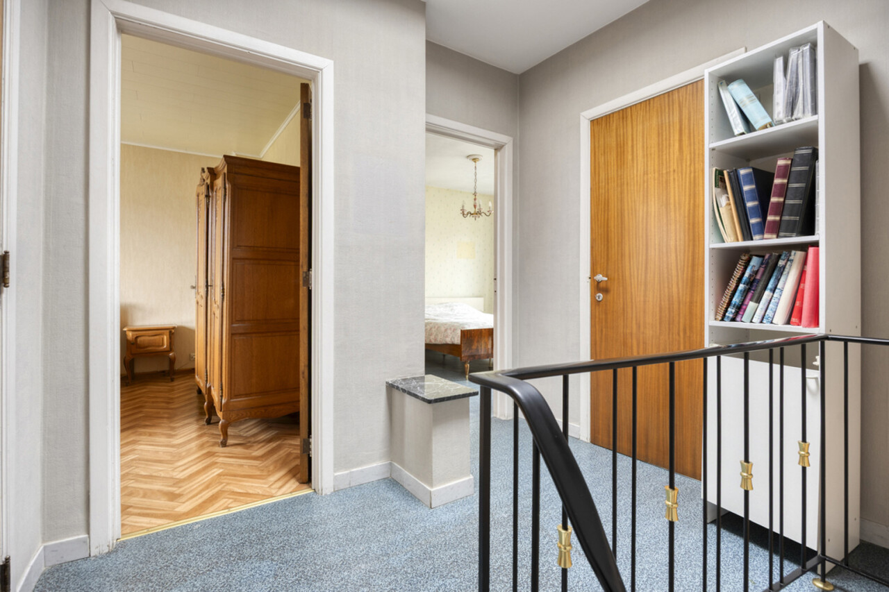 Op de eerste verdieping bevindt zich een lichtrijke living met warme parketvloer en gezellige open haard, die een aangename en huiselijke sfeer creëert. Grote raampartijen zorgen voor veel licht en een ruim gevoel. Aan de straatzijde zijn elektrische rolluiken voorzien voor extra comfort en privacy. De gesloten, volledig ingerichte keuken sluit mooi aan op de leefruimte. Zowel vanuit de keuken als de living heeft u toegang tot het terras van 26 m² met praktische berging, ideaal voor een ontbijt in de zon of een gezellige avond met familie en vrienden.