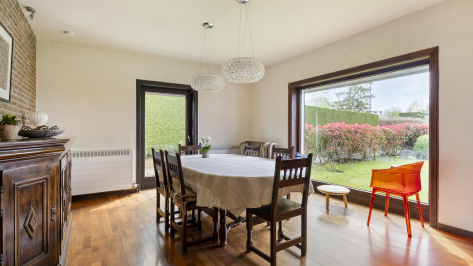 Op de gelijkvloerse verdieping vindt u een doordachte indeling met een inkomhal, een ruime en lichtrijke eetplaats, een aangenaam salon, keuken, nachthal, badkamer, vier volwaardige kamers en twee aparte toiletten.