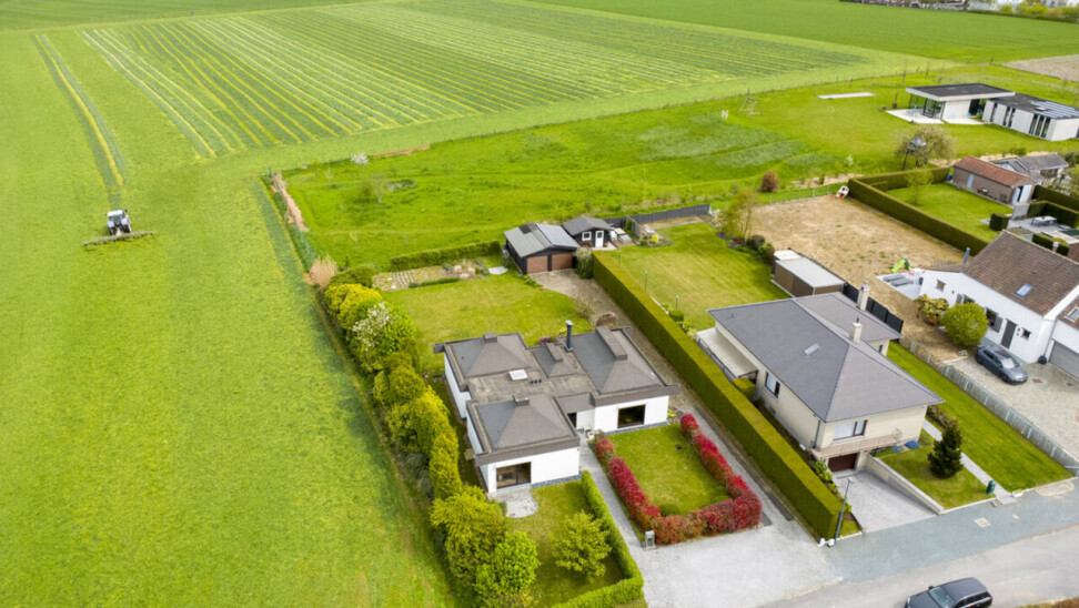 In het charmante en landelijke Relegem, waar rust en dorpsgevoel nog hand in hand gaan, bevindt zich deze zeldzame bungalowvilla met een werkelijk unieke ligging.