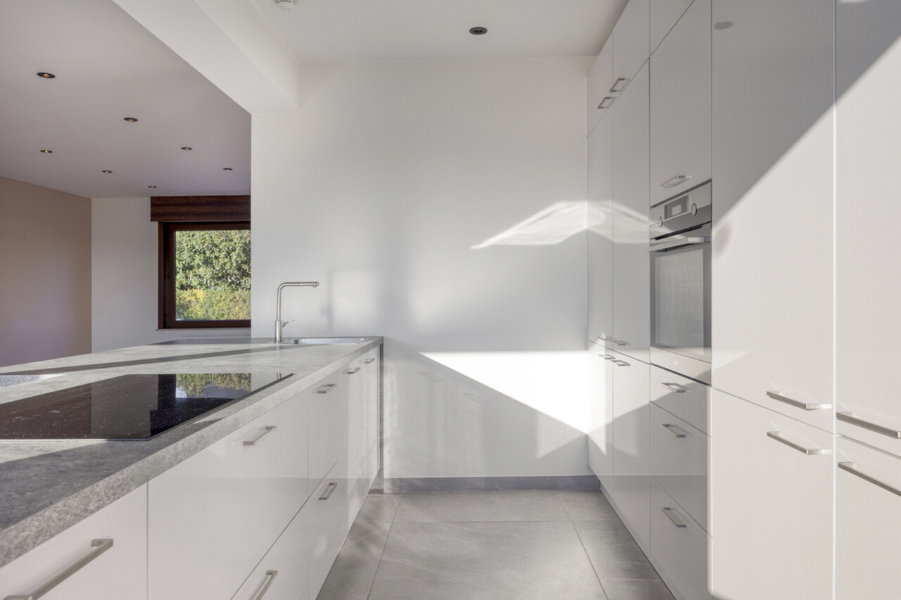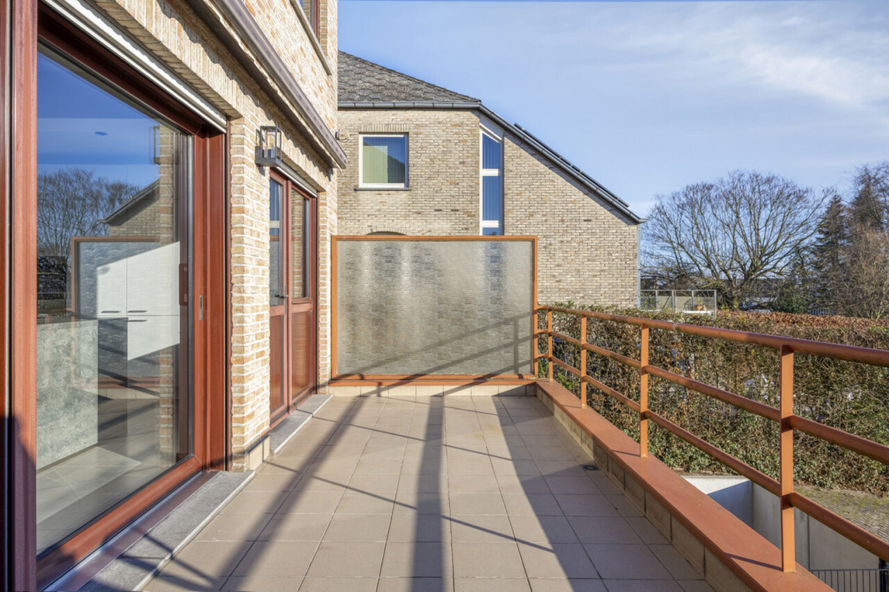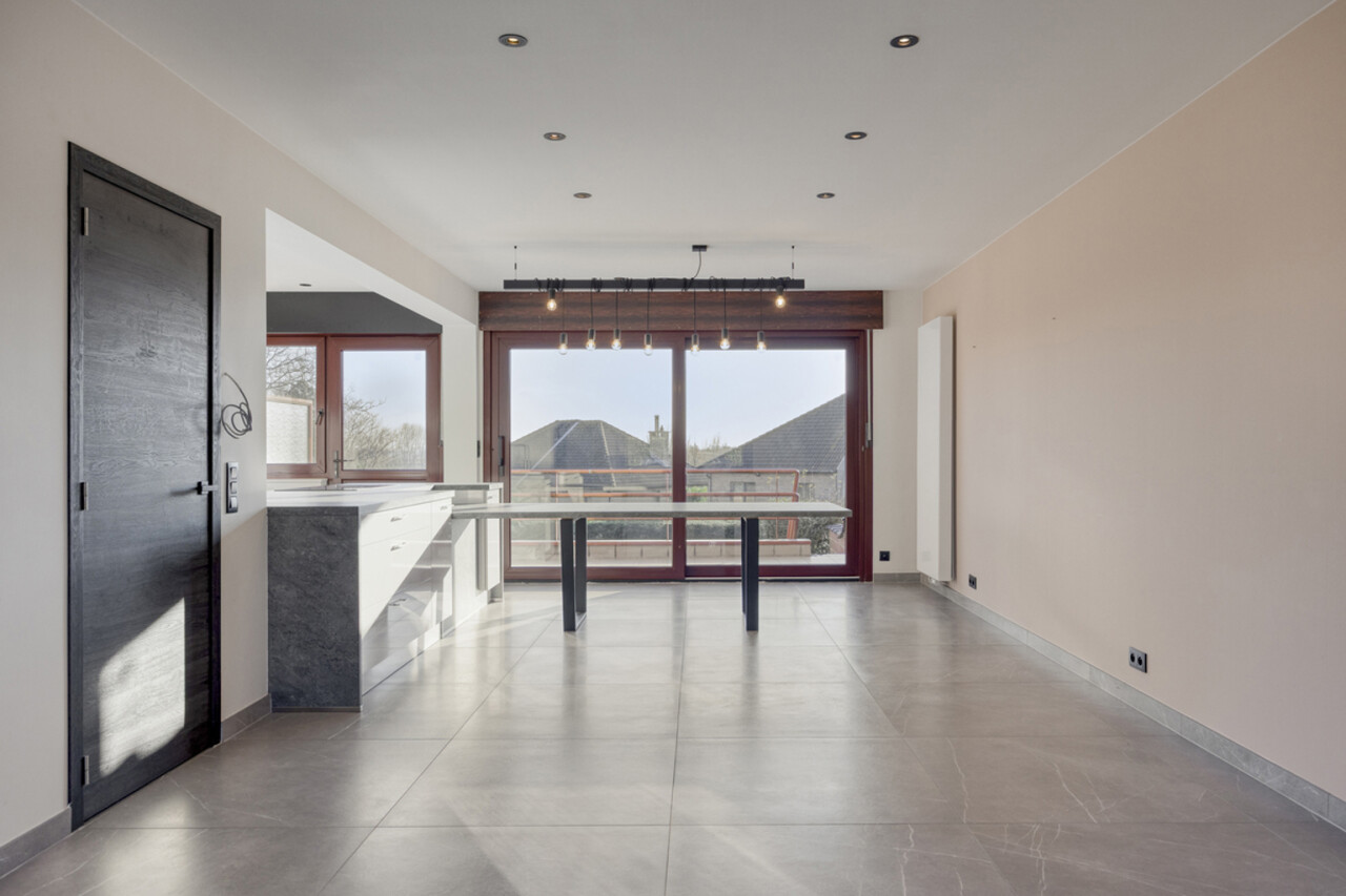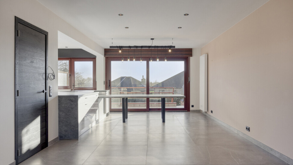gelijkvloers verdiep: inkomhal met vestiaire en gastentoilet, ruime en lichtrijke living met een open hyper geïnstalleerde keuken (totaal = 45m²) met aansluitend een zuidoost gericht terras.