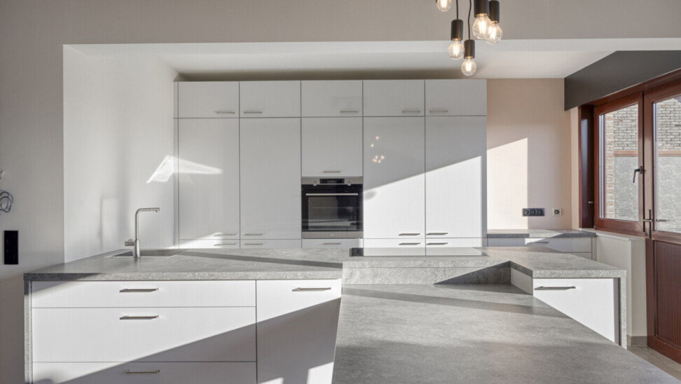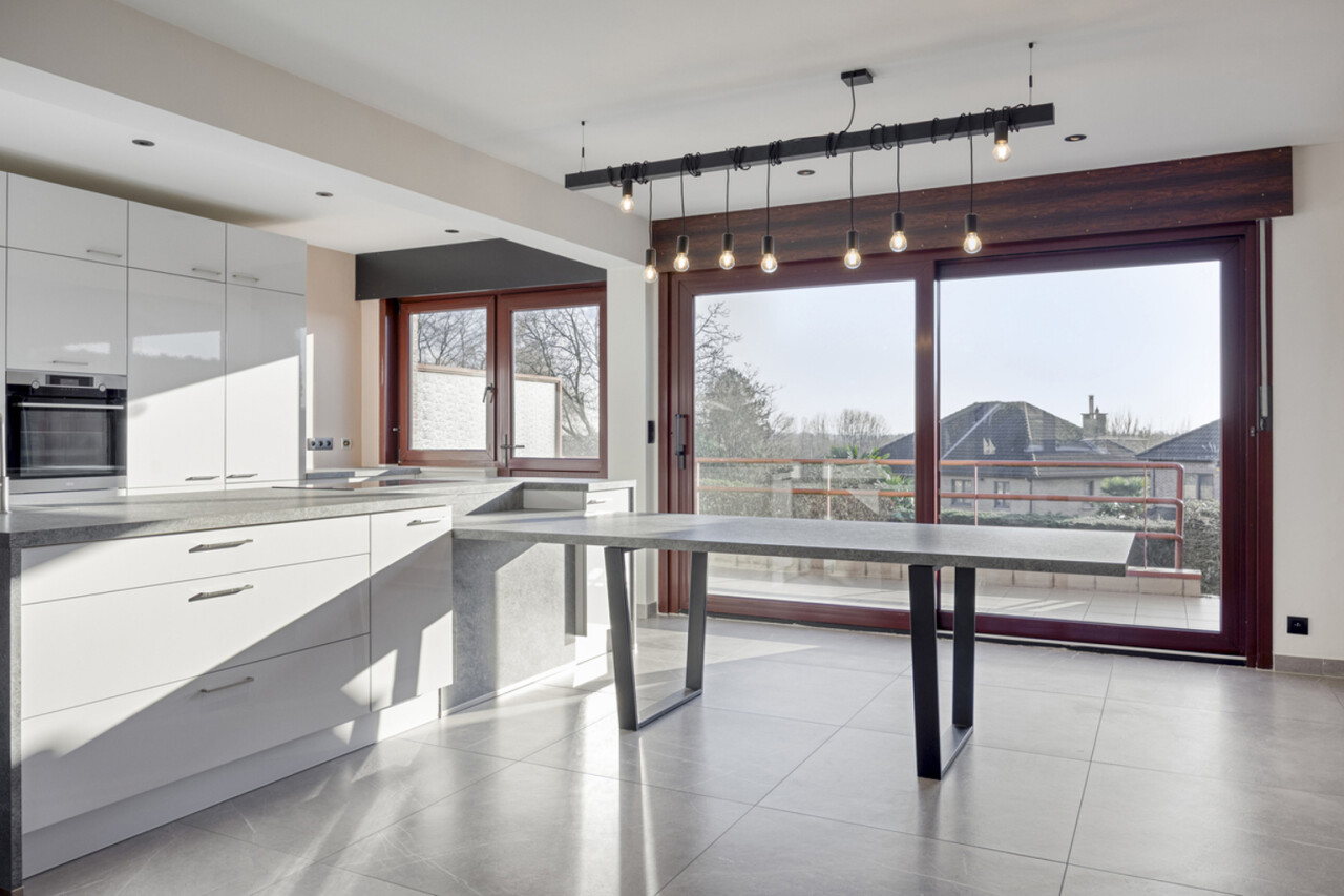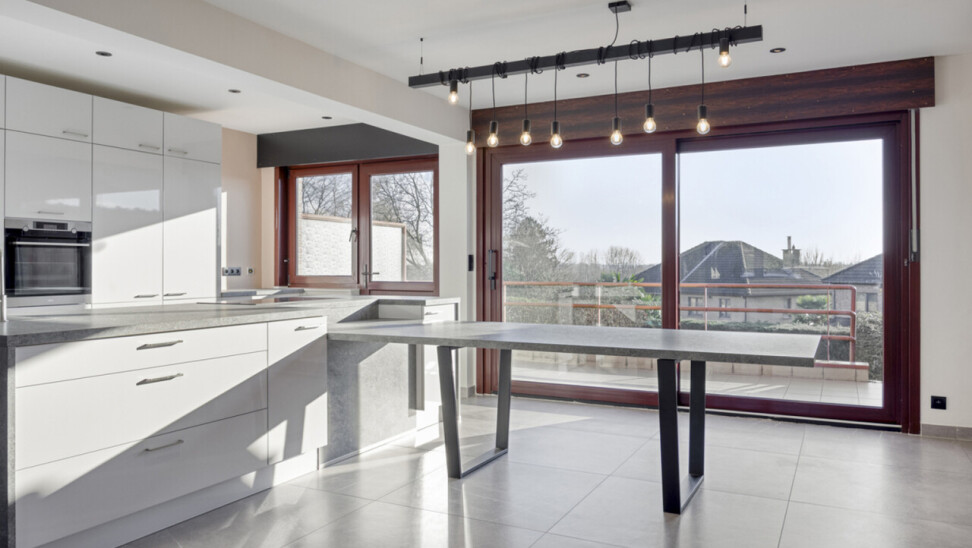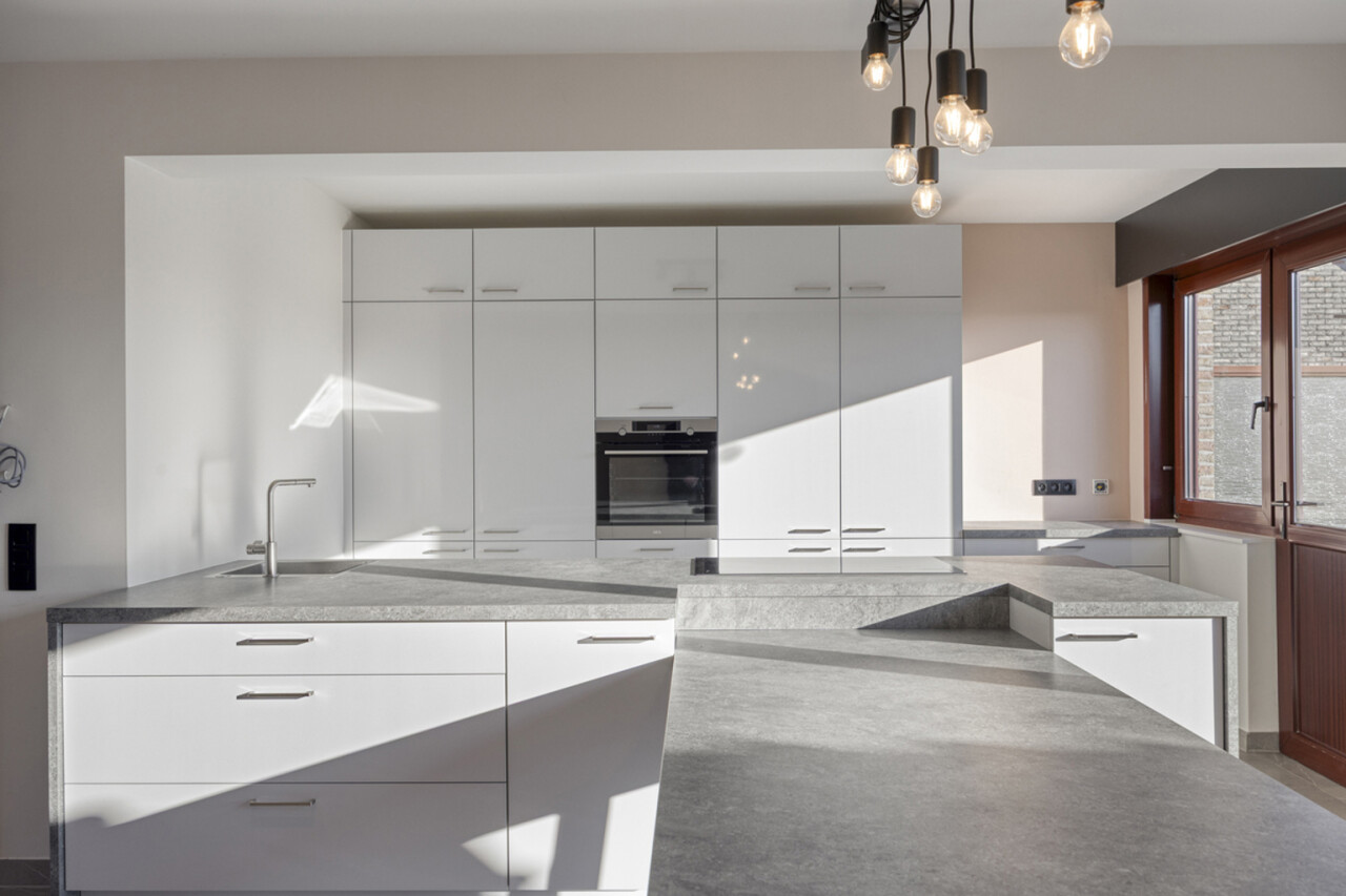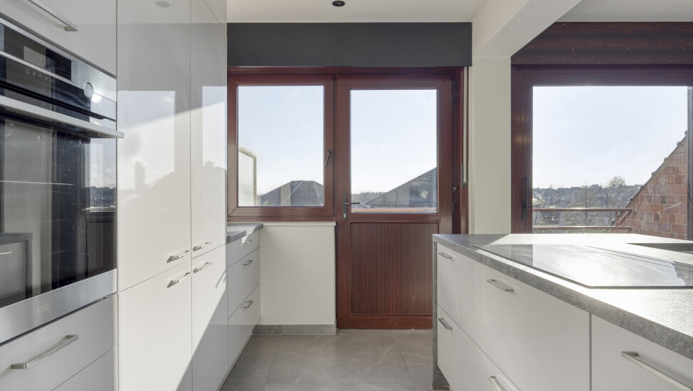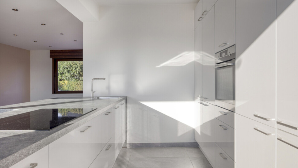 gelijkvloers verdiep: inkomhal met vestiaire en gastentoilet, ruime en lichtrijke living met een open hyper geïnstalleerde keuken (totaal = 45m²) met aansluitend een zuidoost gericht terras.