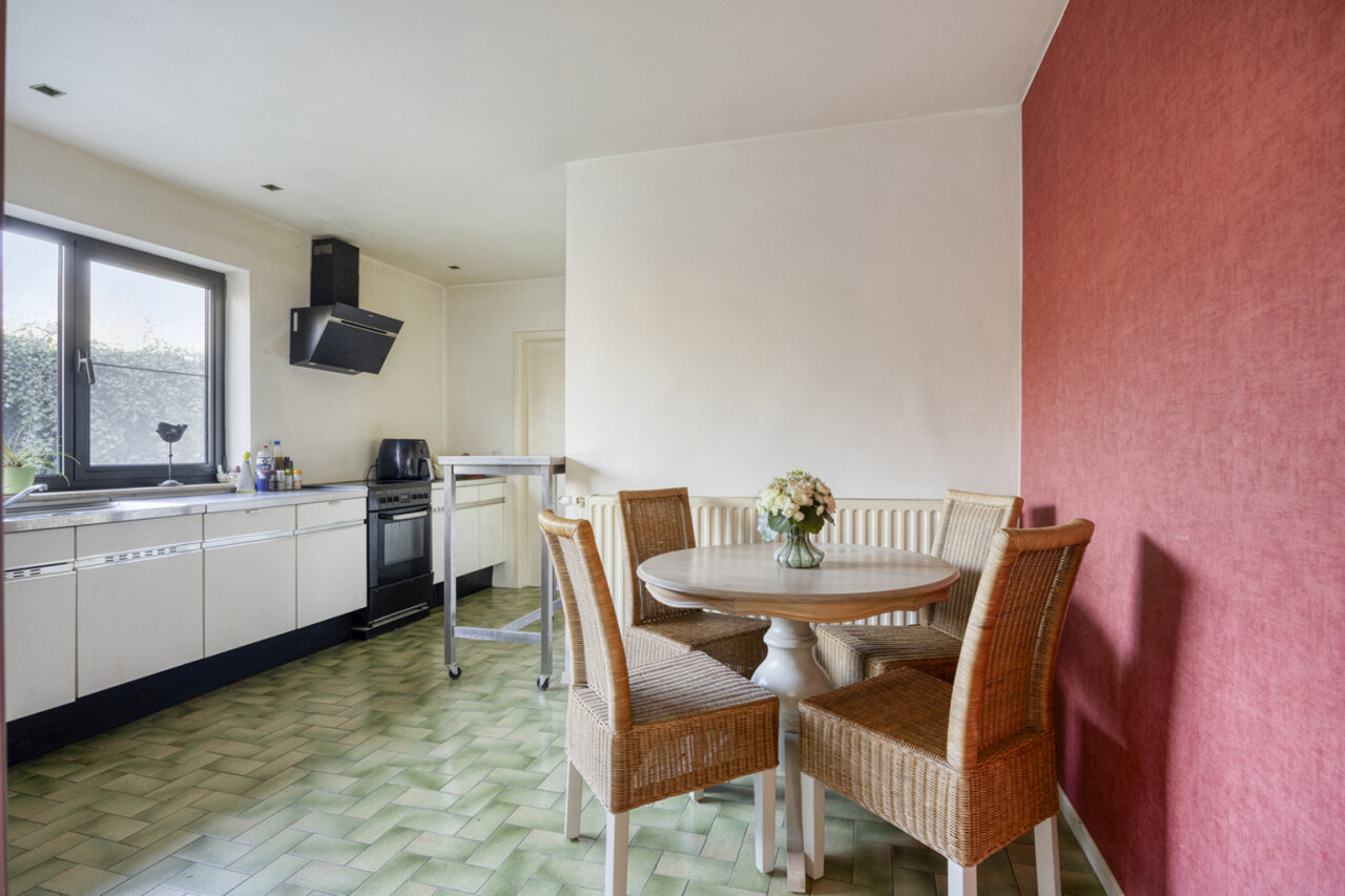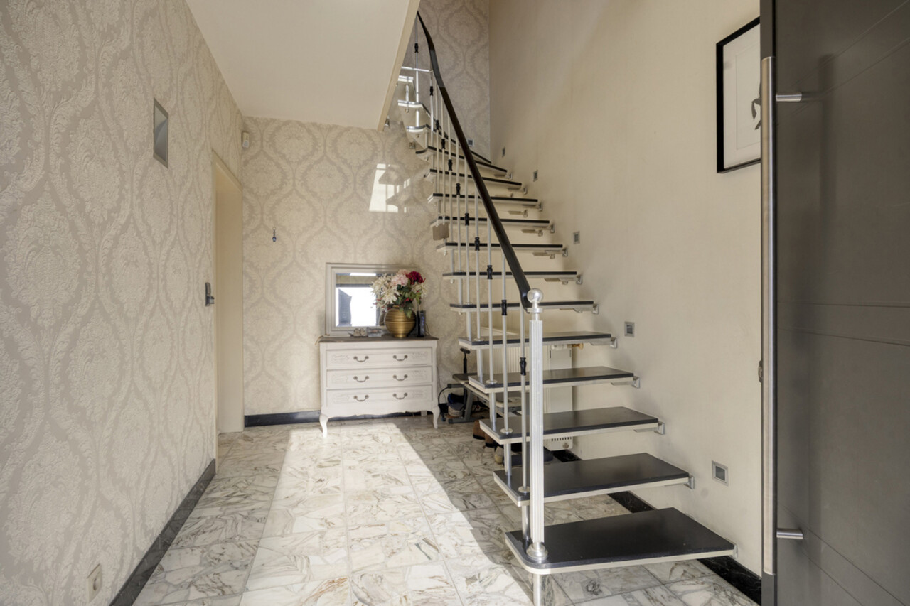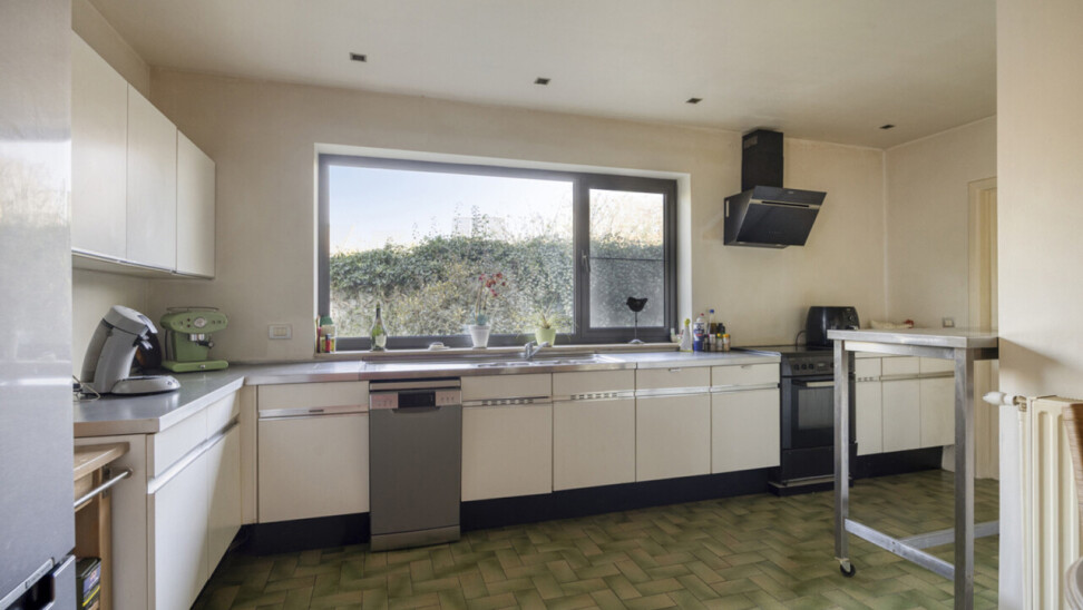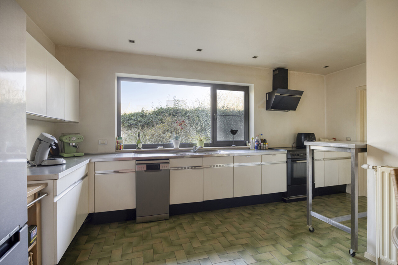 Via de inkomhal betreedt u de lichtrijke woonkamer van 58 m², voorzien van een open haard. Vanuit de living heeft u toegang tot het terras en de onderhoudsvriendelijke, zuidwestgerichte tuin, omgeven door groen. Daarnaast is er ook een uitgang naar de tuin vanuit de keuken, zodat u niet via de living hoeft te gaan met vuile voeten. De keuken staat in verbinding met de technische ruimte en een inpandige garage, praktisch om boodschappen direct uit te laden. Op het gelijkvloers bevindt zich tevens een toilet. Een extra troef is de aparte, niet-inpandige garage van 16 m² die kan dienen als opslagruimte.