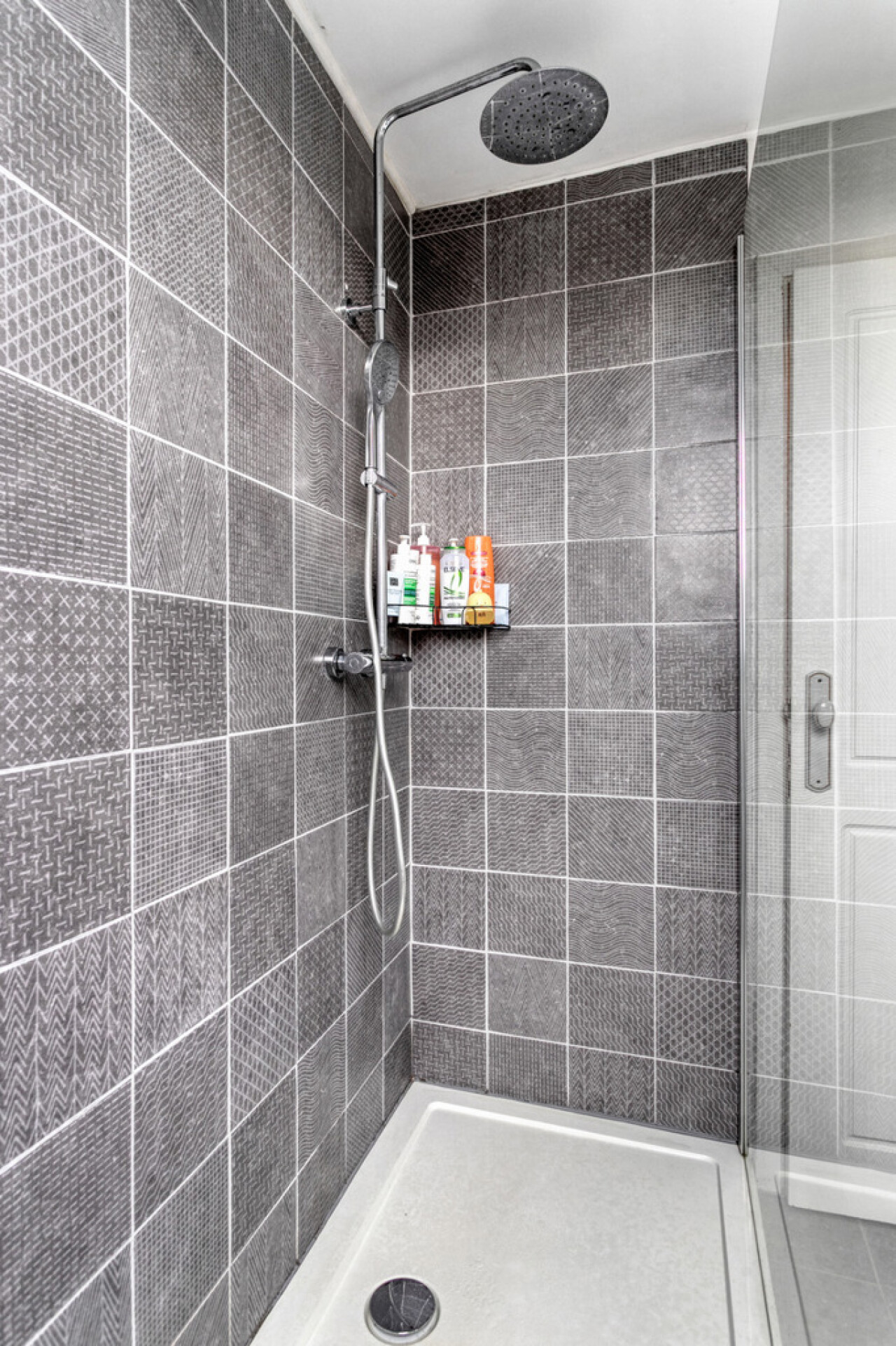 Op de eerste verdieping leidt de nachthal naar drie comfortabele slaapkamers van 15 m², 12 m² en 10 m², en een moderne doucheruimte met inloopdouche, dubbele lavabo en toilet.