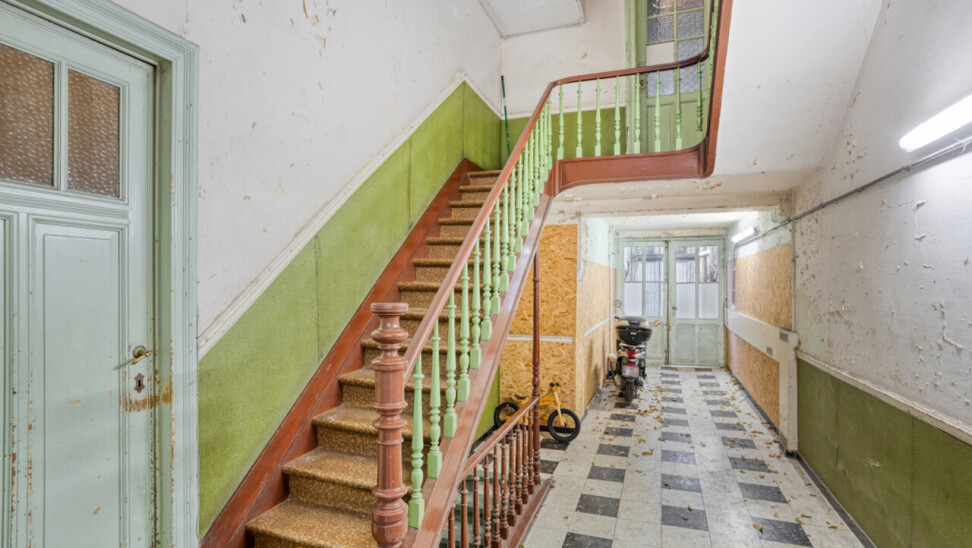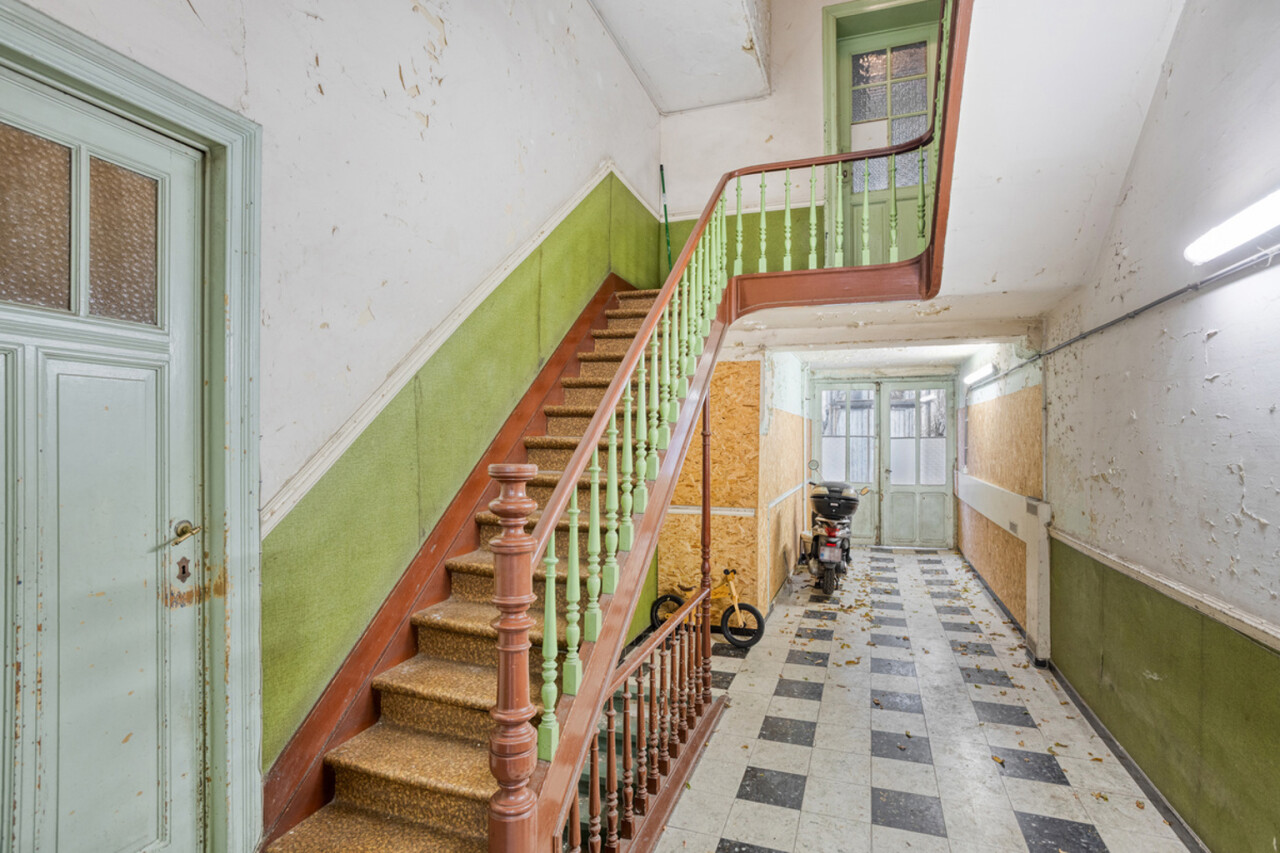 Hoofdgebouw straatkant: indeling: rechts: Inrijpoort (+/- 10m²) , inkomhal en traphal (+/- 26m²) uitgevend op een achterliggende koer (+/- 27m²).