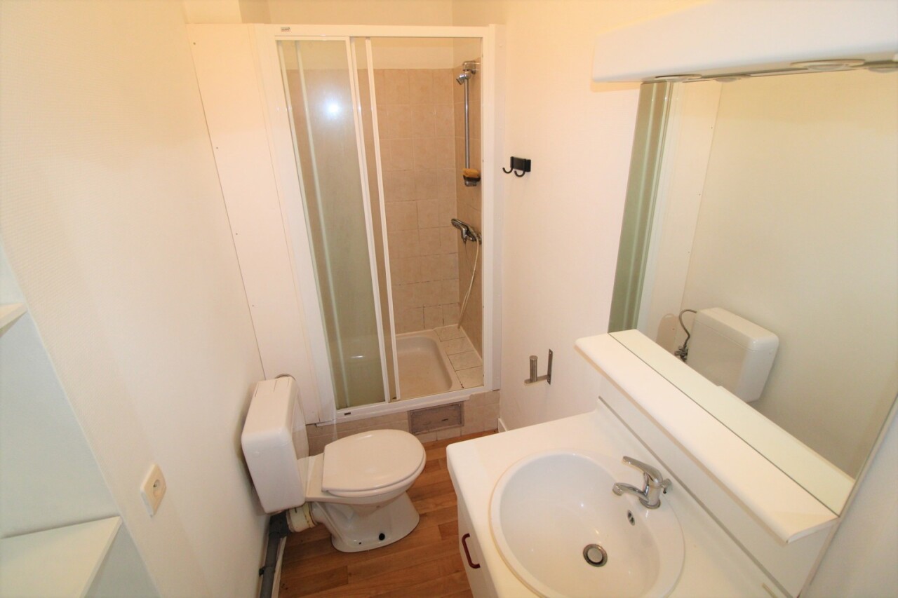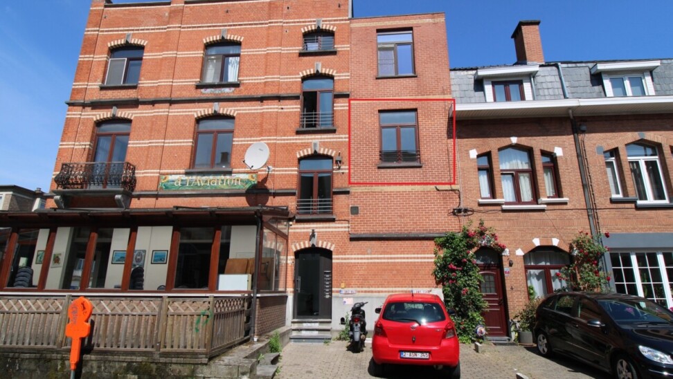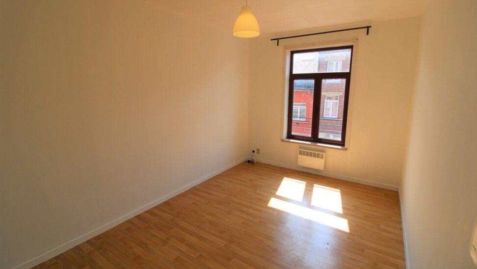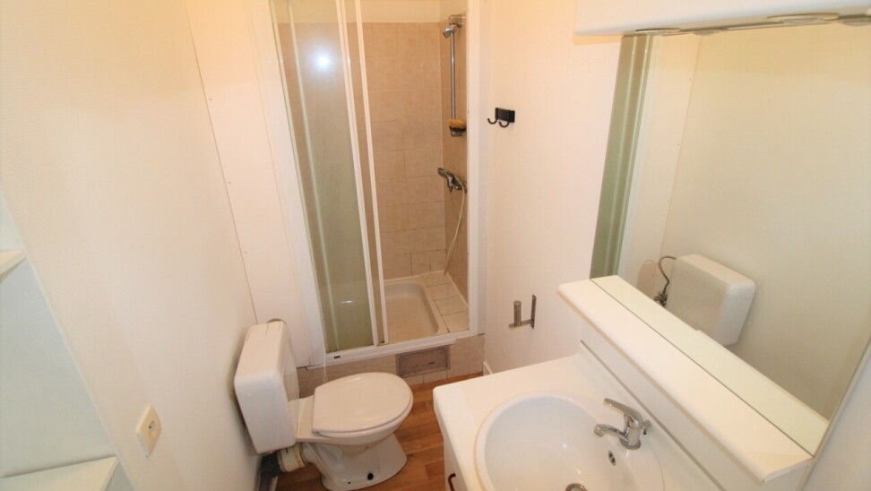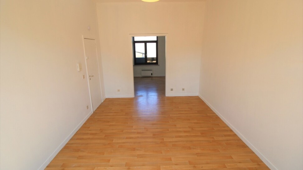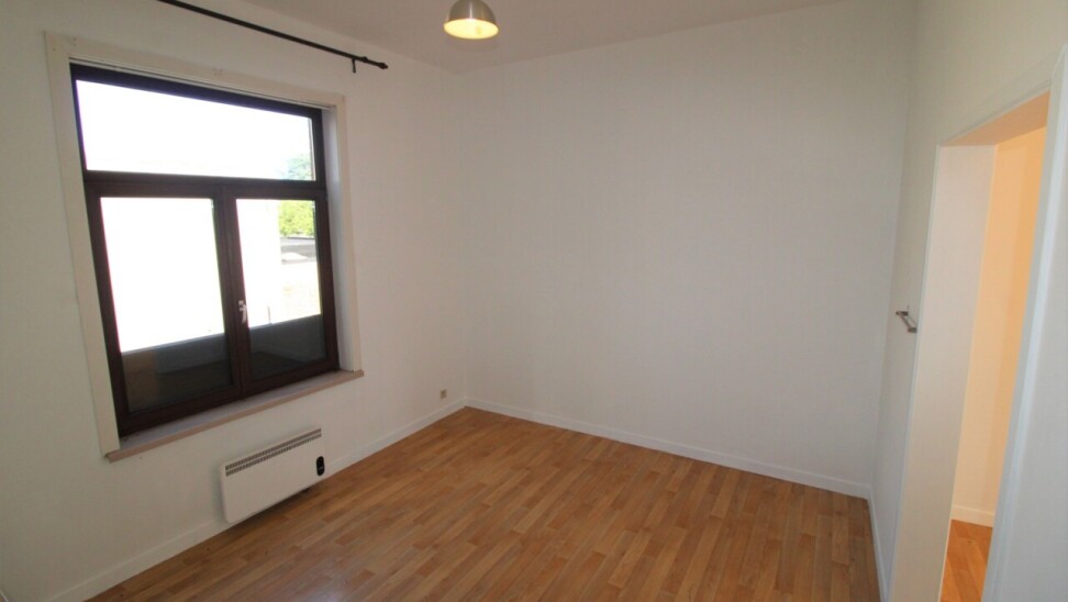 De aparte badkamer is uitgerust met een toilet, lavabo met onderbouwde kast en een douche. De keuken bevindt zich aan de achterkant en is uitgerust met vitro-keramische platen, oven, dampkap, frigo en spoelbak. De living baadt in het licht dankzij de hoge raampartijen.
